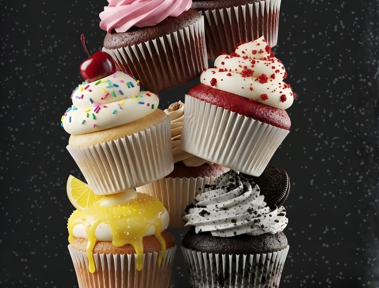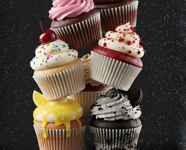 Wheat flour (gluten), salted butter (milk), unsalted butter (milk), granulated sugar, caster sugar, powdered/icing sugar, light brown sugar, eggs, dark chocolate, white and milk chocolate, caramel chocolate, Nutella, cocoa butter, cocoa mass, cocoa powder, emulsifier: soya lecithin, almond flavouring, cocoa powder, cream cheese (milk), vanilla flavouring, caramel, peanut butter, buttercream, syrup, fruits, colouring, cinnamon, nutmeg, lemon juice, biscuits (including Biscoff and Oreo), sprinkles, corn starch, whole milk powder, cocoa mass, marshmallow, corn-starch, baking powder, bicarbonate of soda, salt, water and yeast.
